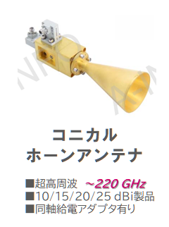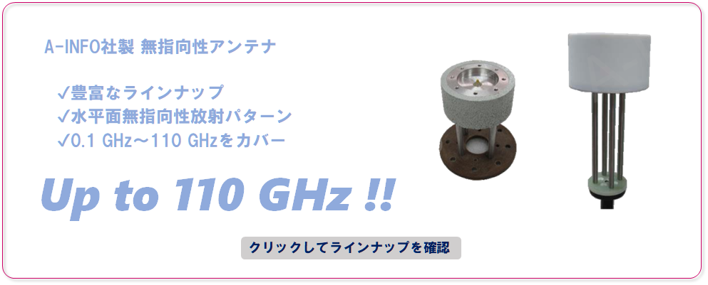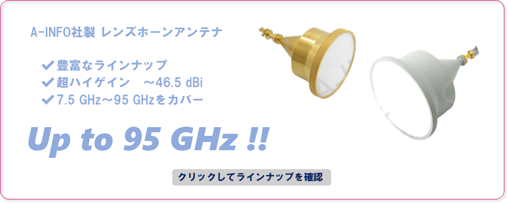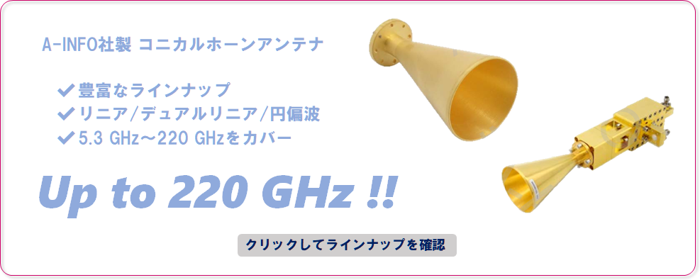弊社では主にRFspin社とA-INFO社製品を中心に、広帯域ホーンアンテナ(ダブルリジッド及びクワッドリジッド)は同軸1mmコネクタタイプで110GHzまでをカバーし、標準ゲインホーンは勿論、円偏波、ミリ波の無指向性アンテナや高指向性レンズホーンアンテナなど、特殊なマイクロ波・ミリ波の用途でご使用頂けるアンテナも多数取り揃えております。